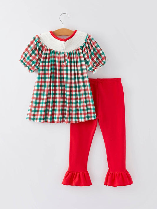 Christmas Smocking Embroidery Girls Plaid Outfit Set