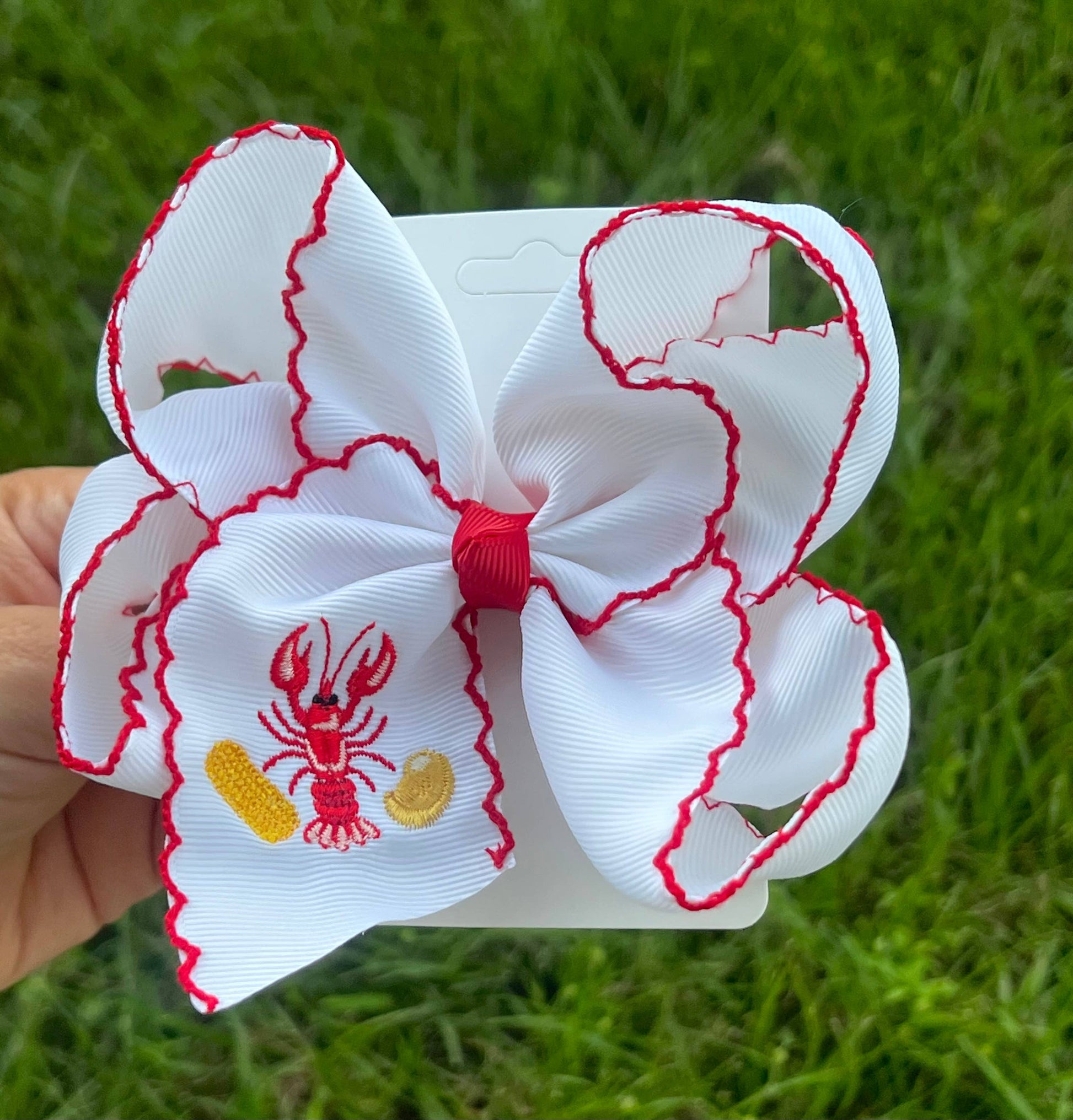 Get ready to celebrate the flavors of the South with our delightful Embroidered Crawfish Boil Hair Bow! Measuring 5 inches, this fun accessory features a vibrant embroidered design that captures the spirit of a classic crawfish boil, complete with lively colors and charming details.